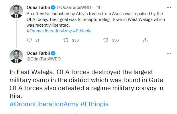 وكتب أودا تاربي تغريدة على تويتر "دمرت قوات جبهة تحرير الأورومو أكبر معسكر للجيش الإثيوبي في المنطقة الواقع في شرق #ولقا في مدينة قوتي. كما هزمت قافلة عسكرية للنظام في مدينة بيلا الواقعة أيضا في شرق #ولقا"