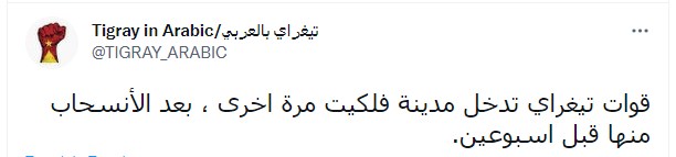 كما أعلنت تيجراي بالعربي أن "قوات تيغراي تدخل مدينة فلكيت مرة أخرى، بعد الانسحاب منها قبل أسبوعين"