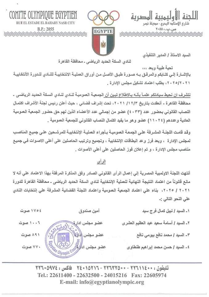 اعتمدت اللجنة الاوليمبية، النتيجة النهائية لانتخابات نادي السكة الحديد للدورة 2021-2022..