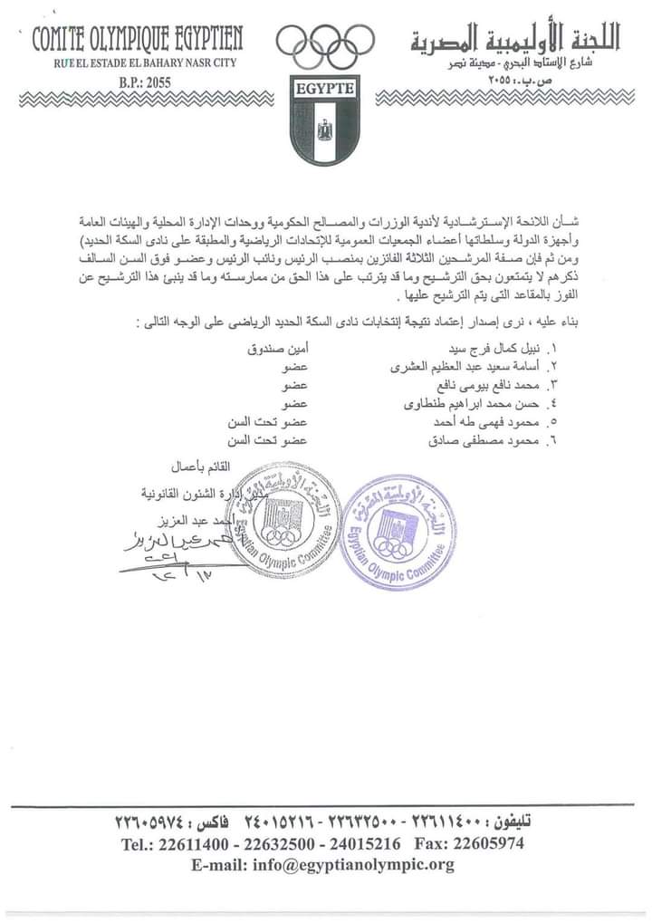 وقررت اللجنة الأوليمبية، بناءً علي اعتماد فوز 6 من مجلس الإدارة بناءً علي الجمعية العمومية واللجنة القضائية المشرفة علي انتخابات السكة الحديد علي النحو التالي: