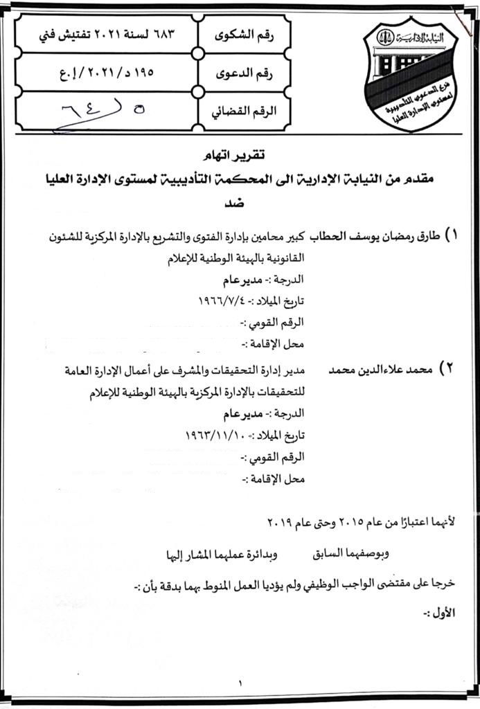 وجاء بتقرير الاتهام الذي أعدته النيابة الإدارية أن محمد علاء محمد، مدير إدارة التحقيقات والمشرف على أعمال الإدارة العامة للتحقيقات بالإدارة المركزية للشئون القانونية بالهيئة الوطنية للإعلام أهمل في الإشراف على أعمال المحال ألأول مما أدى إلى عدم إتخاذه أي إجراء قاطع للتقادم وعدم التنبيه عليه منذ تأشيرته المؤرخة 27 مايو 2015، بالمذكرة المنتهية إلى إرجاء البت وحتى تاريخ إبلاغ النيابة الإدارية بالواقعةمما أدى إلى عدم تتبع رئيس القطاع المالي بالهيئة تأديبيًا لمرور أكثر من 3 سنوات على آخر إجراء قاطع للتقادم