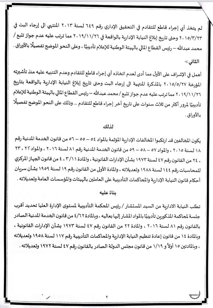 وتضمنت مذكرة الإحالة أن طارق رمضان يوسف، كبير محامين بإدارة الفتوى والتشريع بالإدارة المركزية للشئون القانونية بالهيئة الوطنية للإعلام لم يتخذ أي إجراء قاطع للتقادم في التحقيق الإداري رقم 649 لسنة 2013، المنتهي إلى إرجاء البت في 23 مارس عام 2015، وحتى تاريخ إبلاغ النيابة الإدارية بالواقعة في 26 نوفمبر 2019، مما ترتب عليه عدم جواز تتبع محمد عبد الله، رئيس القطاع المالي بالهيئة الوطنية للإعلام تأديبيًا