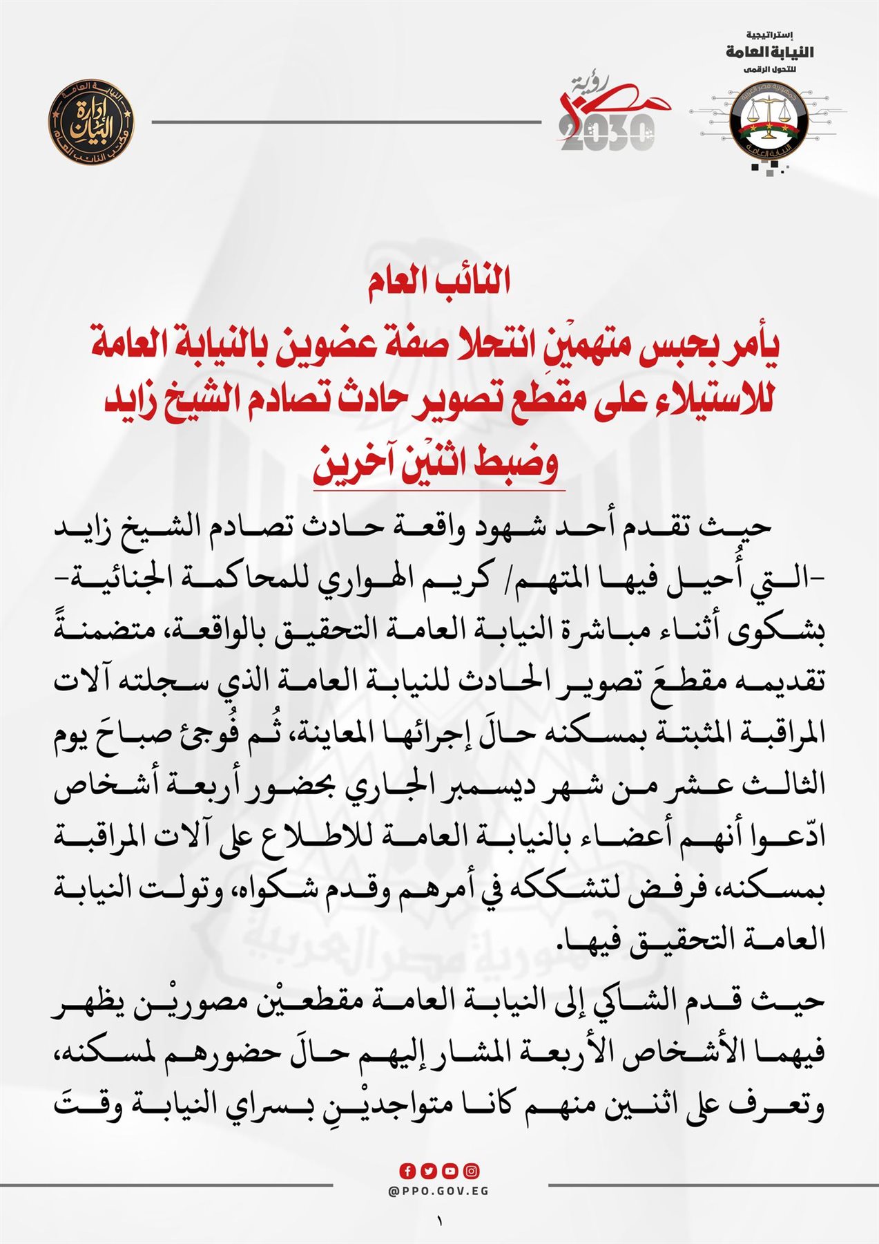 وأمر النائب العام بحبس متهمين انتحلا صفة عضوين بالنيابة العامة للاستيلاء على مقطع تصوير حادث تصادم الشيخ زايد وضبط اثنين آخرين.