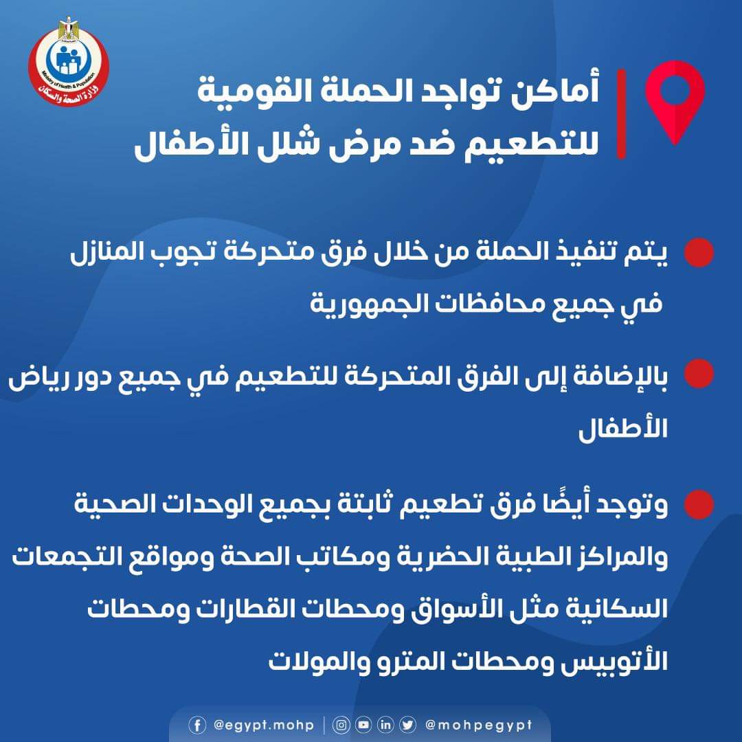 كشفت وزارة الصحة عن أماكن إطلاق الحملة القومية للتطعيم ضد شلل الأطفال مشيرة الي ان الحملة ستنفذ من خلال فرق متحركة تمر علي المنازل وكذلك فرق ثابته بجميع الوحدات الصحية ومراكز الرعاية الصحية ومكاتب الصحة ومحطات المترو والقطارات والأسواق والأتوبيس والمولات.