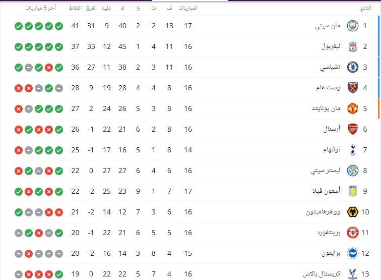 وفيما يلي جدول ترتيب الدوري الإنجليزي: