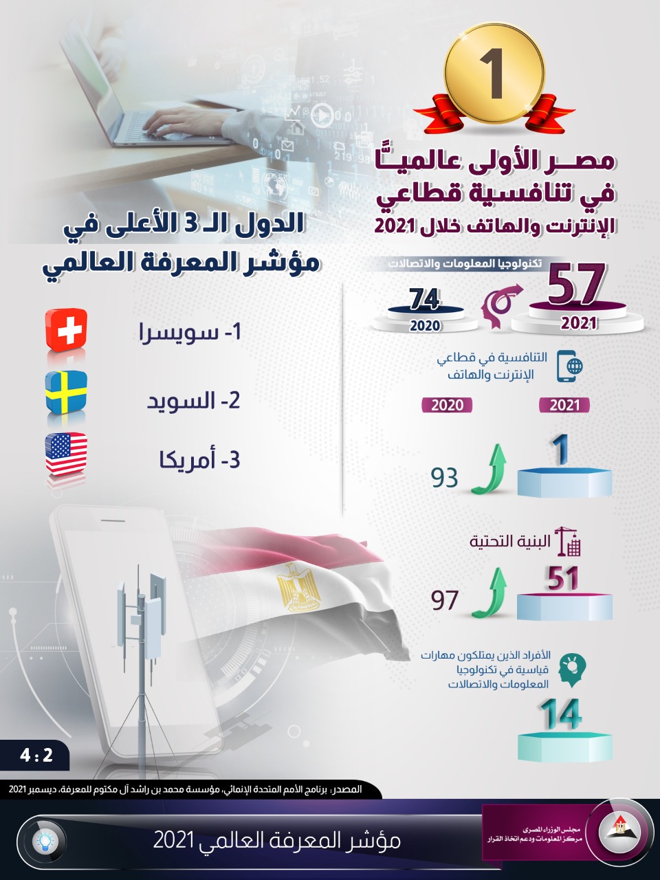 وعلى صعيد المؤشرات الفرعية فقد حققت فيها مصر تقدمًا ملحوظًا، حيث جاءت مصر في المرتبة الأولى عالميًّا في تنافسية قطاعي الإنترنت والهاتف خلال 2022.