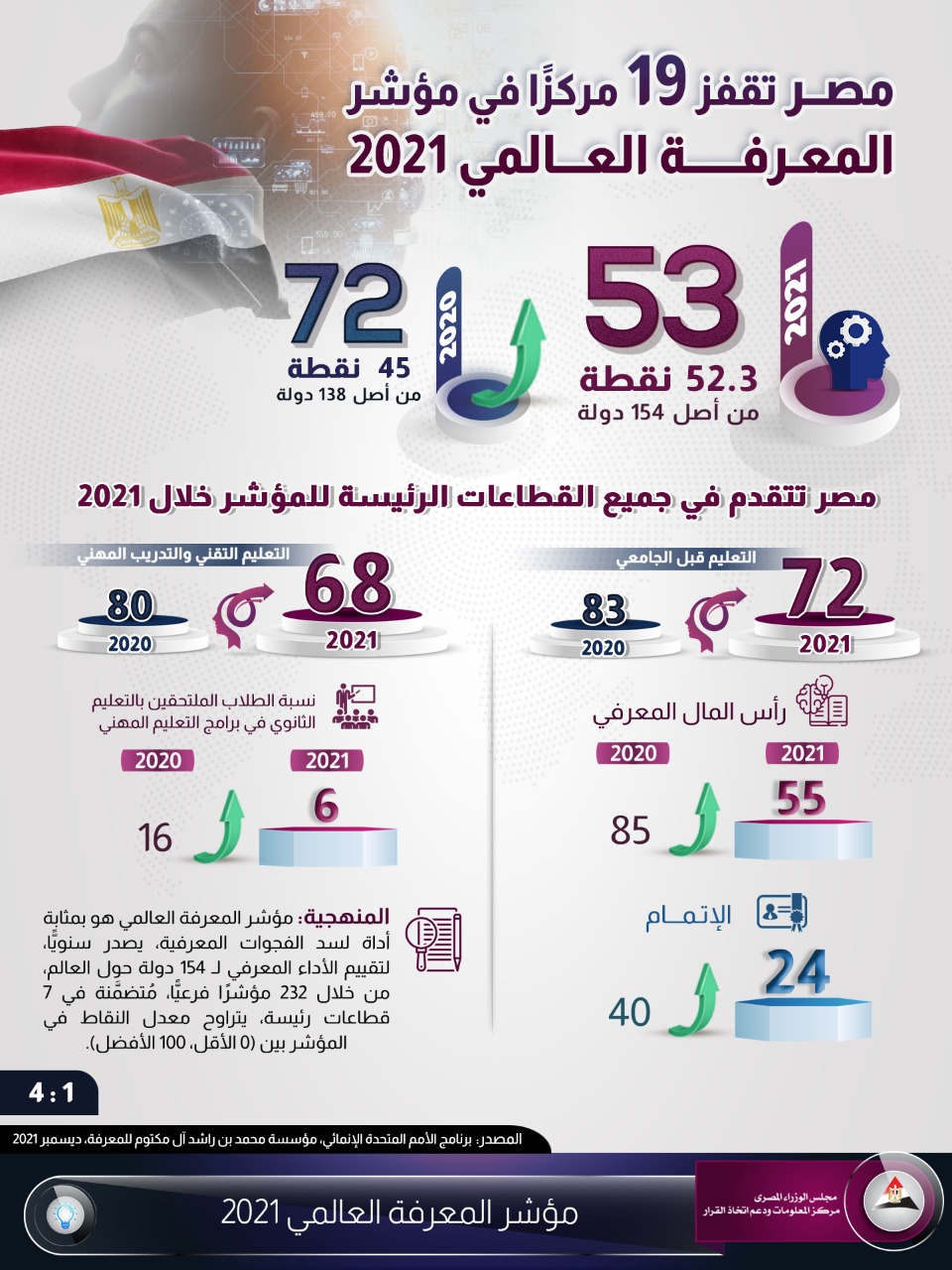 نشر مركز المعلومات ودعم اتخاذ القرار إنفو جرافيك جديدًا يستعرض تقدم مصر في مؤشر المعرفة العالمي خلال 2021، وقد قفزت مصر إلى المرتبة 53 في المؤشر خلال 2021 مقارنة بالمرتبة 72 في 2020.