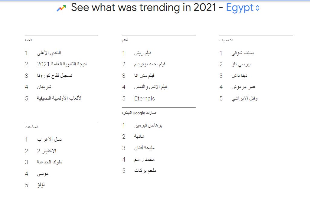 وجاء النادي الأهلي في المركز الأول في مجال البحث على جوجل من المصريين بشكل عام، وفي المركز الثاني نتيجة الثانوية العامة 2021، ثم أتى في المركز الثالث تسجيل لقاح كورونا.