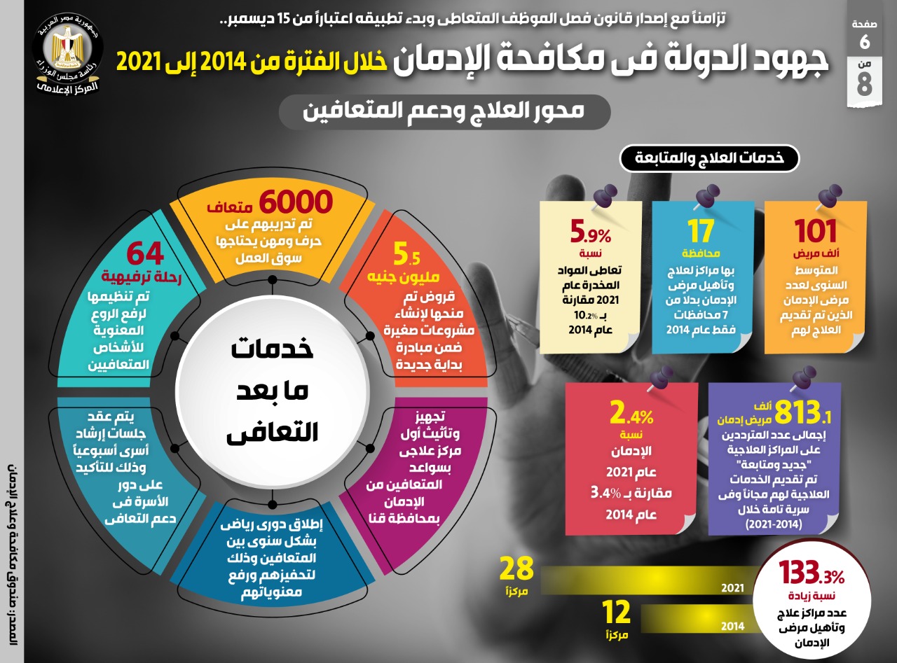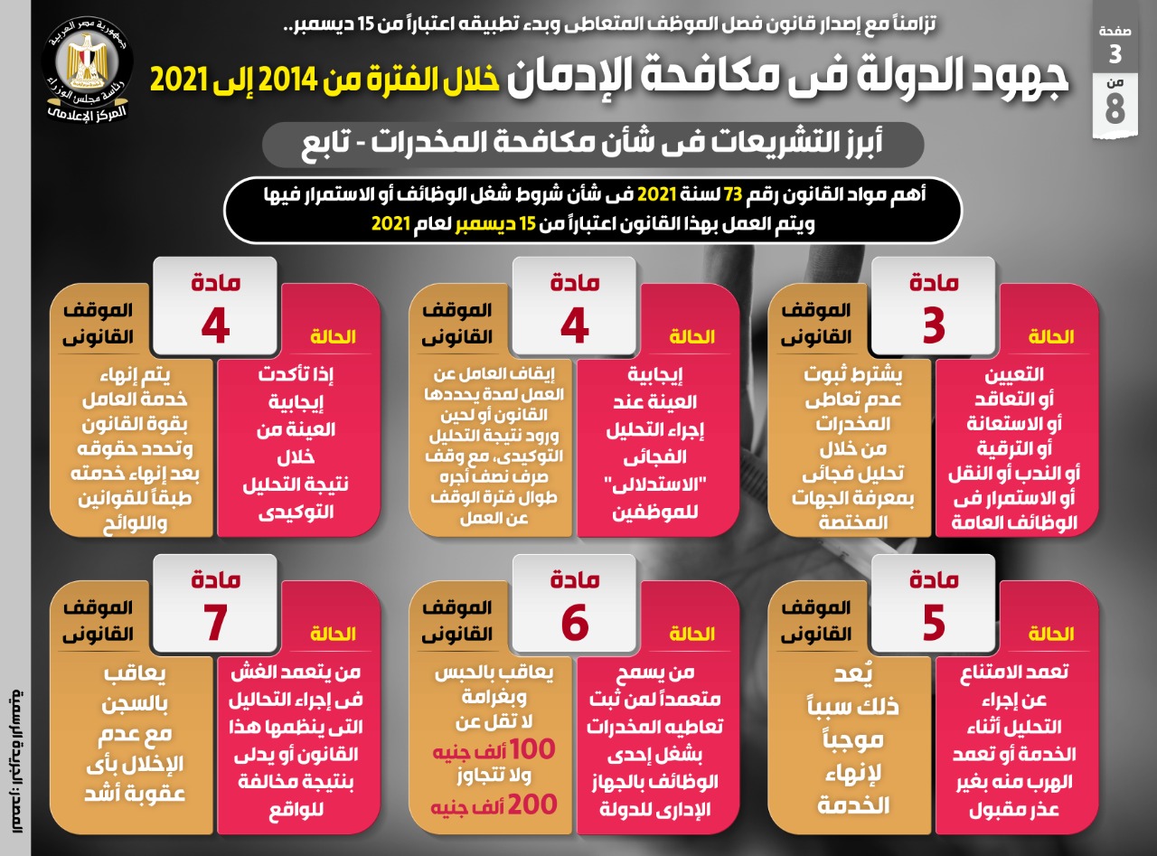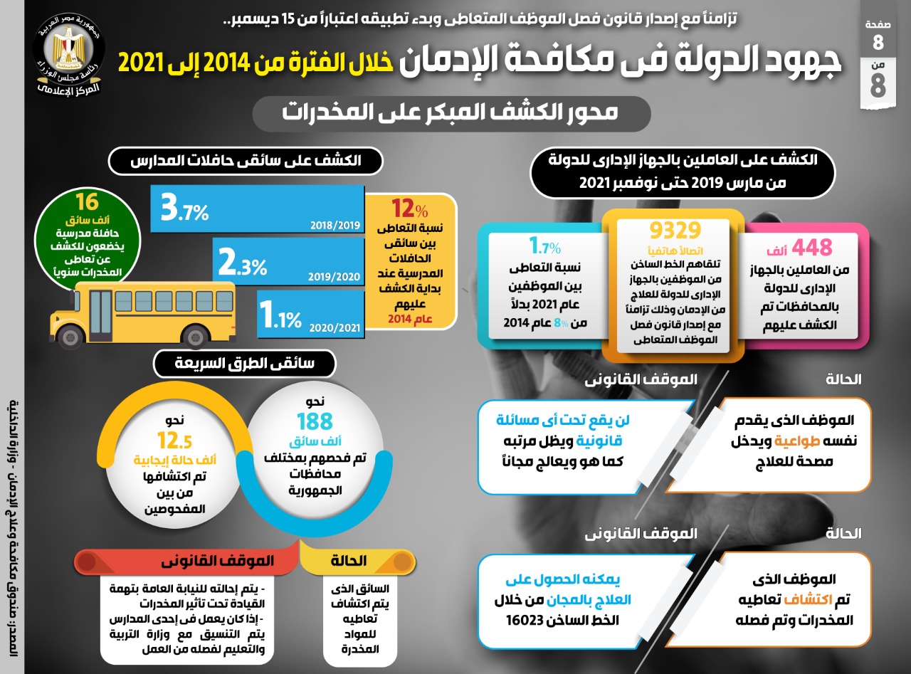 وفي هذا الصدد نشر المركز الإعلامي لمجلس الوزراء تقريرًا تضمن إنفوجرافات تسلط الضوء على جهود الدولة في مكافحة الإدمان خلال الفترة من 2014 إلى 2021، وذلك بالتزامن مع إصدار قانون فصل الموظف المتعاطي وبدء تطبيقه اعتبارًا من 15 ديسمبر.