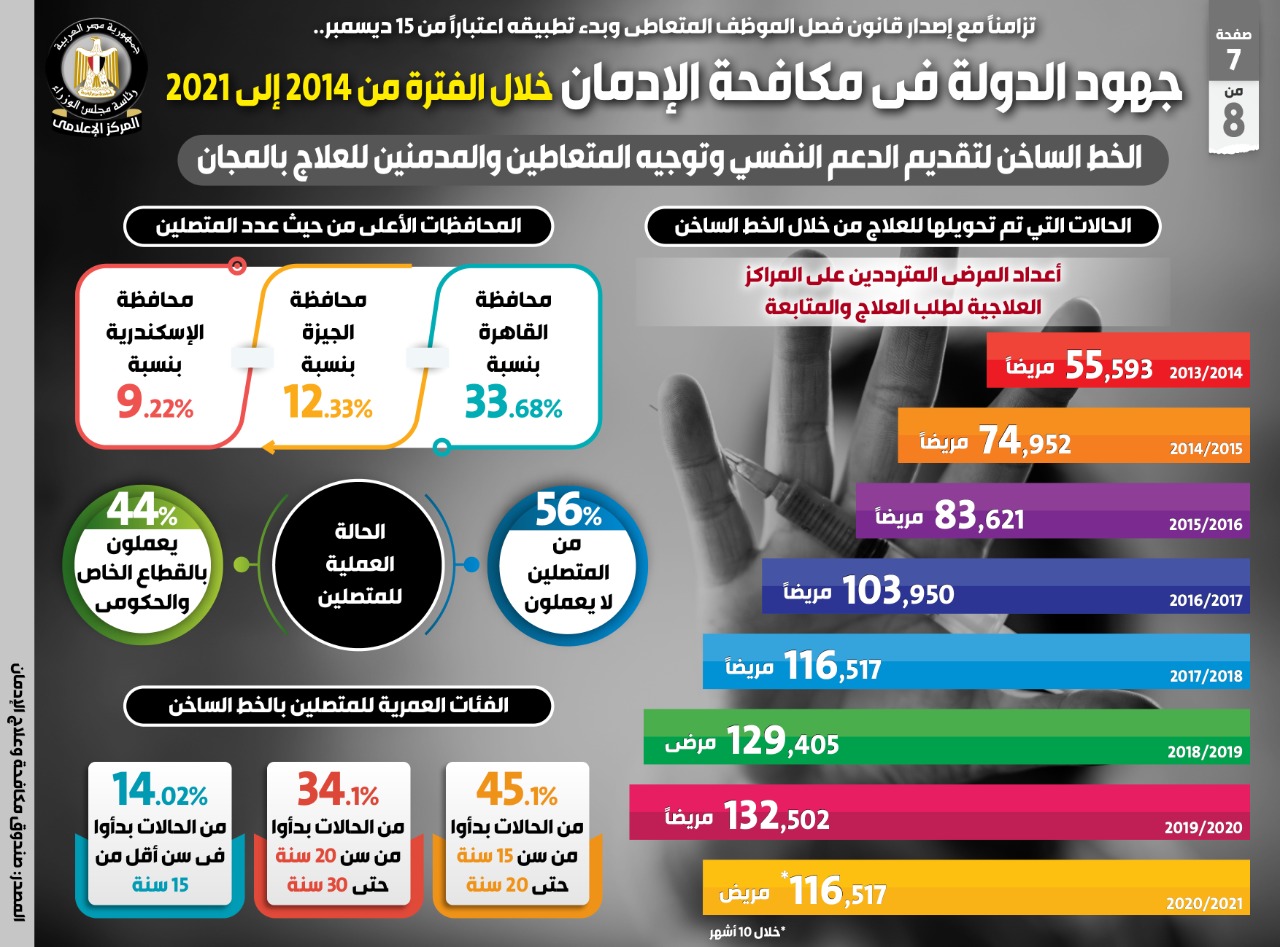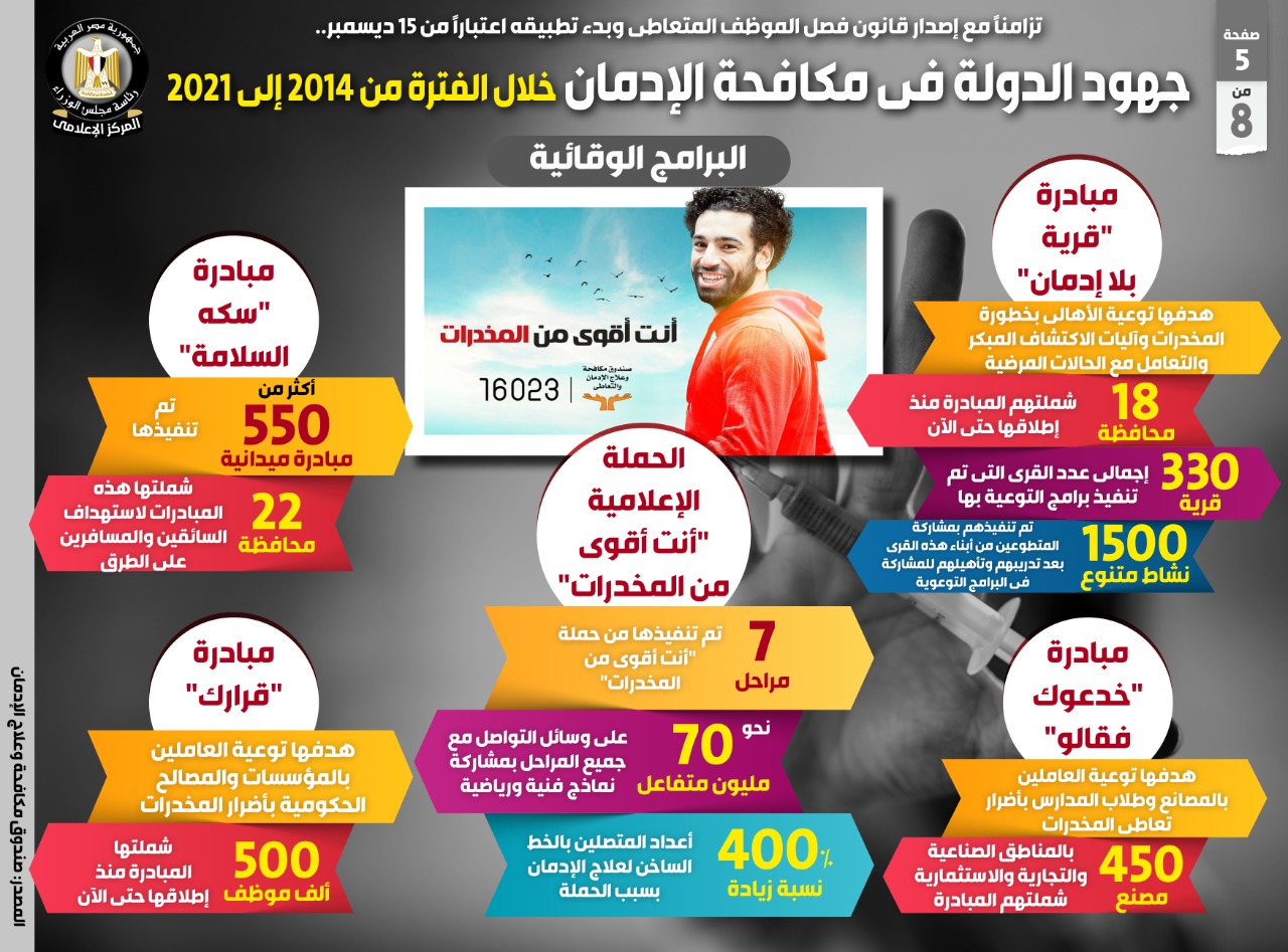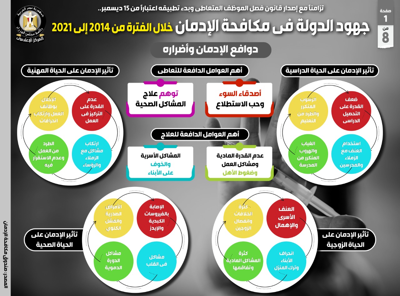 وفي هذا الصدد نشر المركز الإعلامي لمجلس الوزراء تقريرًا تضمن إنفوجرافات تسلط الضوء على جهود الدولة في مكافحة الإدمان خلال الفترة من 2014 إلى 2021، وذلك بالتزامن مع إصدار قانون فصل الموظف المتعاطي وبدء تطبيقه اعتبارًا من 15 ديسمبر.