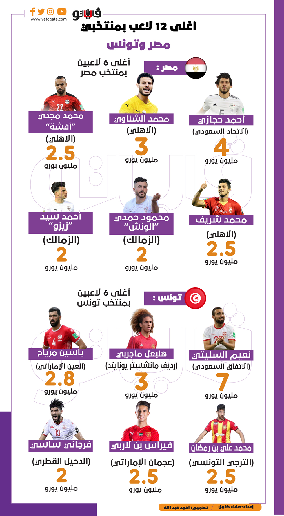 أغلى 12 لاعب بمنتخبي مصر وتونس|انفو جراف الأربعاء 15/ديسمبر/2021 - 05:05 م 12/15/2021 5:05:12 PM منتخب مصر صفاء كامل شارك طباعة 18 حجم الخط شارك طباعة تونس قيمة تسويقية مصر كأس العرب مصر وتونس موعد مباراة مصر وتونس