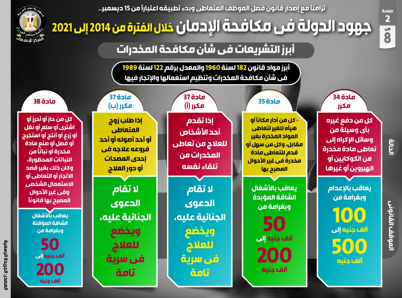 بدأت مصر رسميا تطبيق قانون فصل الموظف المتعاطي للمخدرات اعتبارًا من اليوم الأربعاء الموافق من 15 ديسمبر 2021.