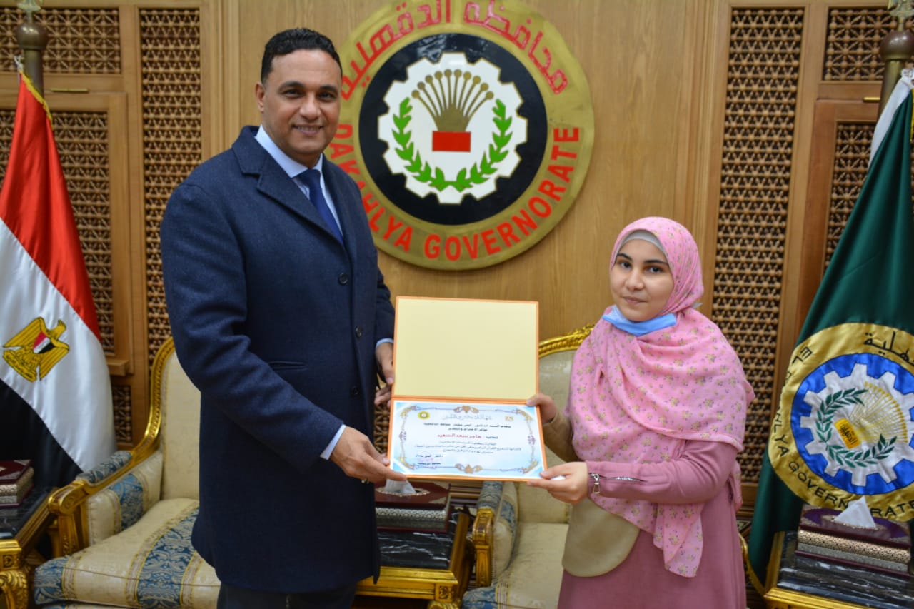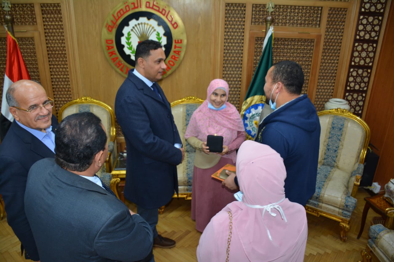 كرم الدكتور أيمن مختار محافظ الدقهلية، اليوم الأربعاء، الطالبة هاجر سعد السعيد بالفرقة الثالثة بقسم التفسير وعلوم القرآن بكلية الدراسات الاسلامية والعربية للبنات بالمنصورة.