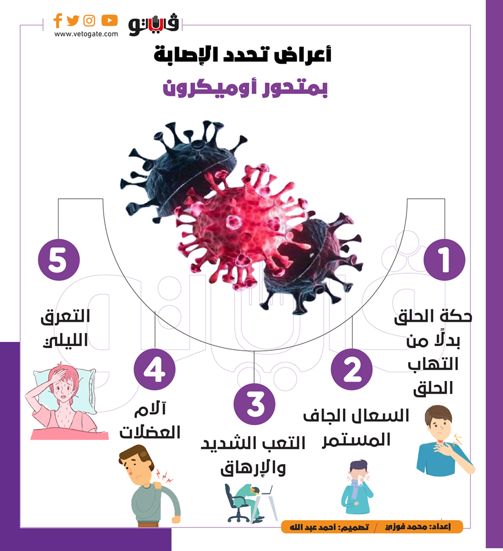 5 أعراض تحدد الإصابة بمتحور أوميكرون | إنفوجراف الأربعاء 15/ديسمبر/2021 - 08:10 م 12/15/2021 8:10:04 PM أوميكرون شارك طباعة 18 حجم الخط شارك طباعة Omicron متحور كورونا الجديد سلالة كورونا الجديدة متحور كورونا الإفريقي جنوب أفريقيا متحور أوميكرون