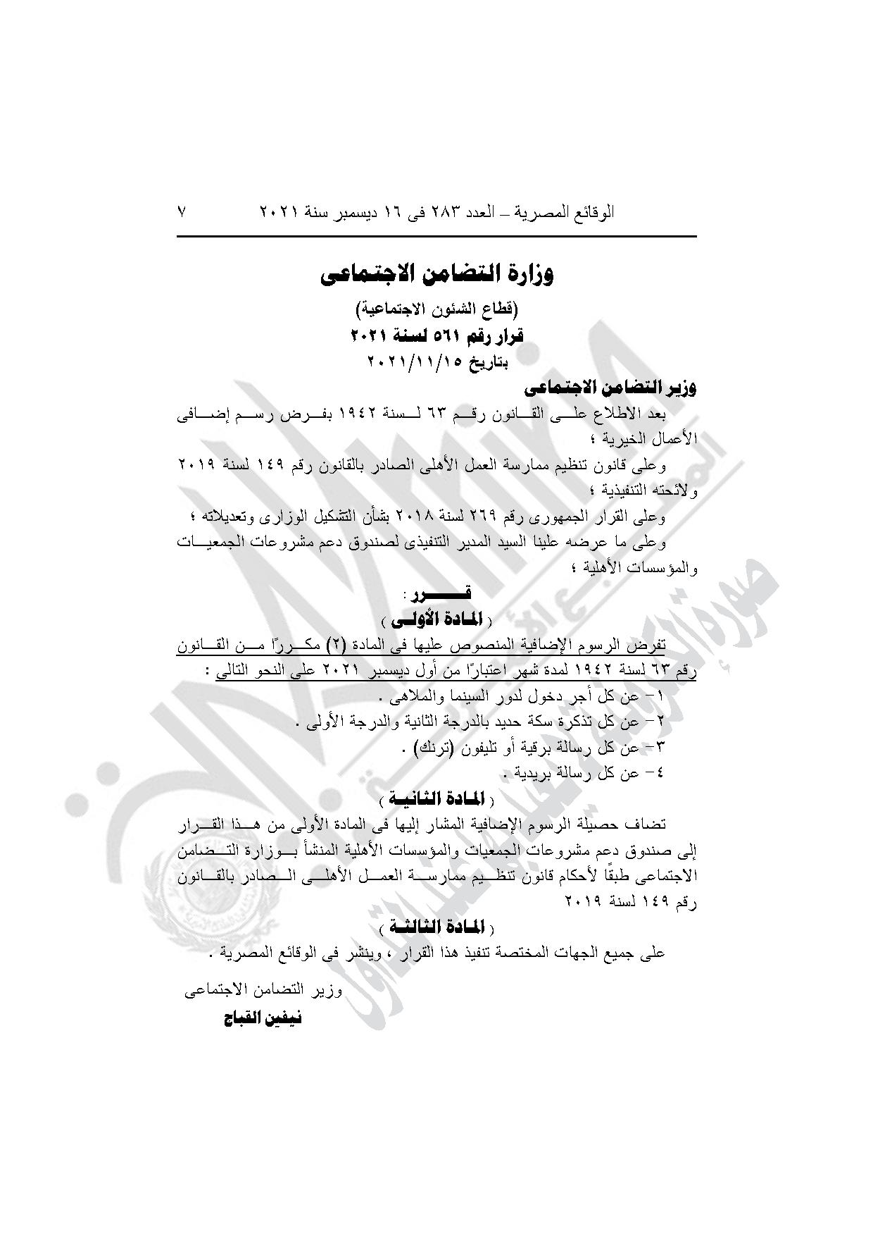نشرت جريدة الوقائع المصرية في عددها رقم 283، الصادر في 16 ديسمبر 2021، قرار وزارة التضامن الاجتماعي رقم 561 لسنة 2021، بشأن فرض الرسوم الإضافية عن كل أجر دخول لدور السينما والملاهي وعن كل تذكرة سكة حديد بالدرجة الثانية والدرجة الأولى وعن كل رسائل برقية أو تليفون "ترانك" وعن كل رسالة بريدية، لصالح صندوق دعم مشروعات الجمعيات والمؤسسات الأهلية.