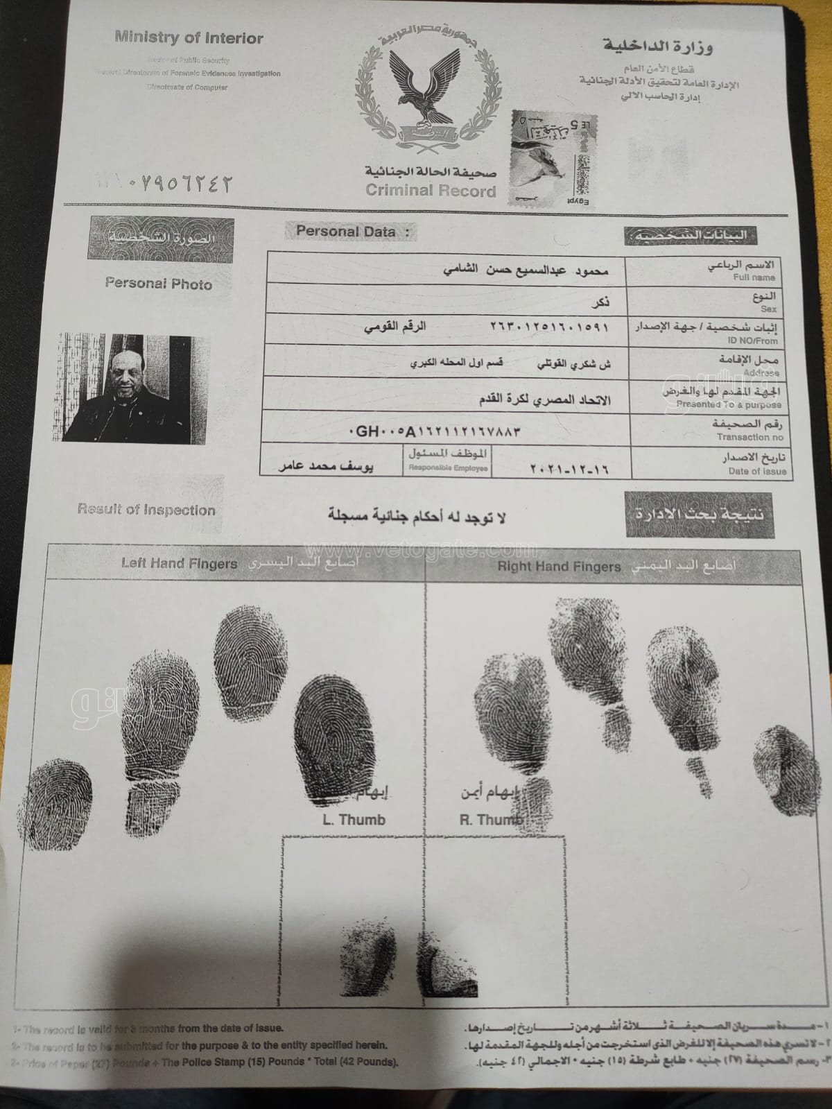 وبدأ محمود الشامي تجهيز أوراقه لخوض انتخابات اتحاد الكرة، حيث حصلت «فيتو» على صورة من صحيفة الحالة الجنائية التي استخرجها اليوم موجهة للجبلاية من أجل الترشح في الانتخابات المقبلة.