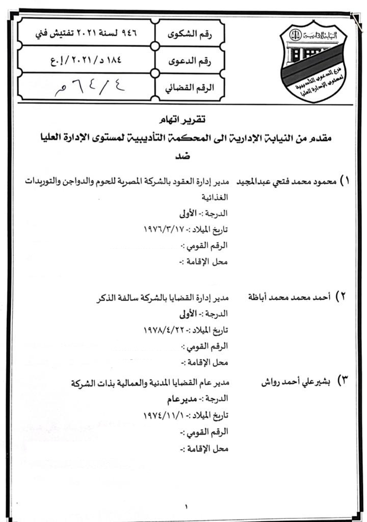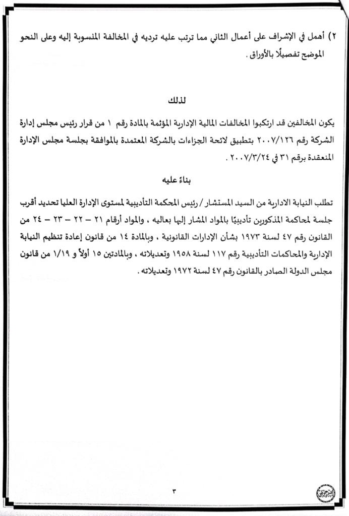 وأكدت التحقيقات أن المحال الثالث أهمل في الإشراف على أعمال الثاني مما ترتب عليه ترديه في المخالفة المنسوبة إليه، وانتهت إلى أن المحالين الثلاثة ارتكبوا المخالفات المالية والإدارية المؤثمة بالمادة رقم 1 من قرار رئيس مجلس إدارة الشركة رقم 126 لسنة 2007، بشأن تطبيق لائحة الجزاءات بالشركة المعتمدة بالموافقة بجلسة مجلس الإدارة المنعقدة برقم 31 في 24 مارس عام 2007