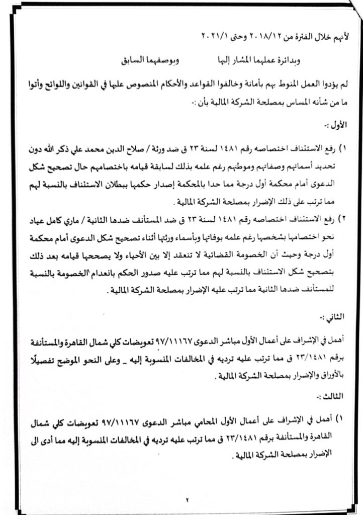 وكشفت تحقيقات إدارة التفتيش الفني على الإدارات القانونية بوزارة العدل أن المحال رفع الإستئناف اختصاصه رقم 1481 لسنة 23 قضائية ضد ضد المستأنف ضدها الثانية ماري كامل عياد، وأختصامها بشخصها رغم علمه بوفاتها وبأسماء ورثتها أثناء تصحيح شكل الدعوى أمام محكمة أول درجة.