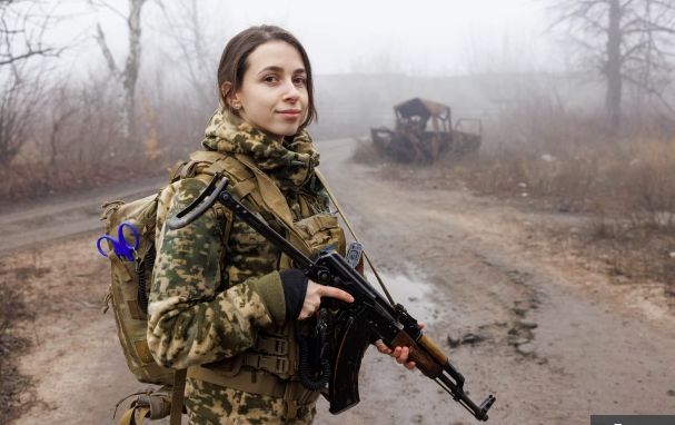 وكان من بين المقاتلين في هذه الوحدة نساء، والتقط مصور "الصن" صورة لمقاتلة أوكرانية وهي تحمل بندقية كلاشينكوف وبدت واثقة من نفسها، رغم الأجواء المتوترة في المحيط.