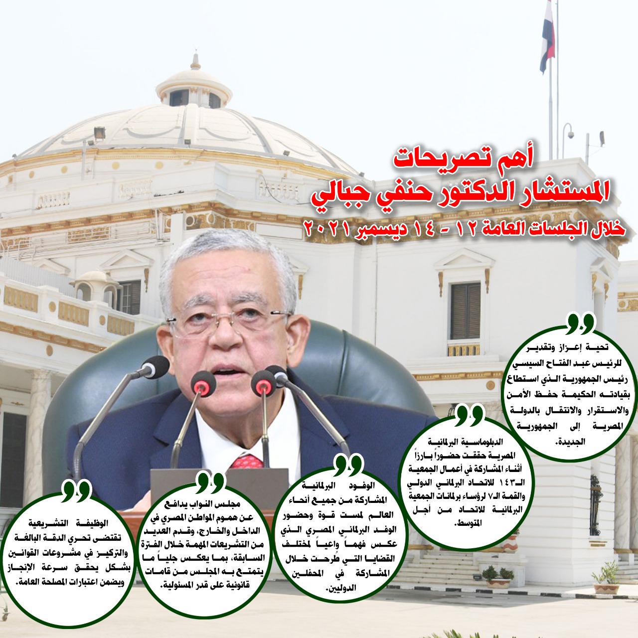شهدت الجلسات العامة لمجلس النواب، الأسبوع المنقضى، إعلان رئيس المجلس المستشار الدكتور حنفي جبالي، عددا من التصريحات والكلمات الهامة.