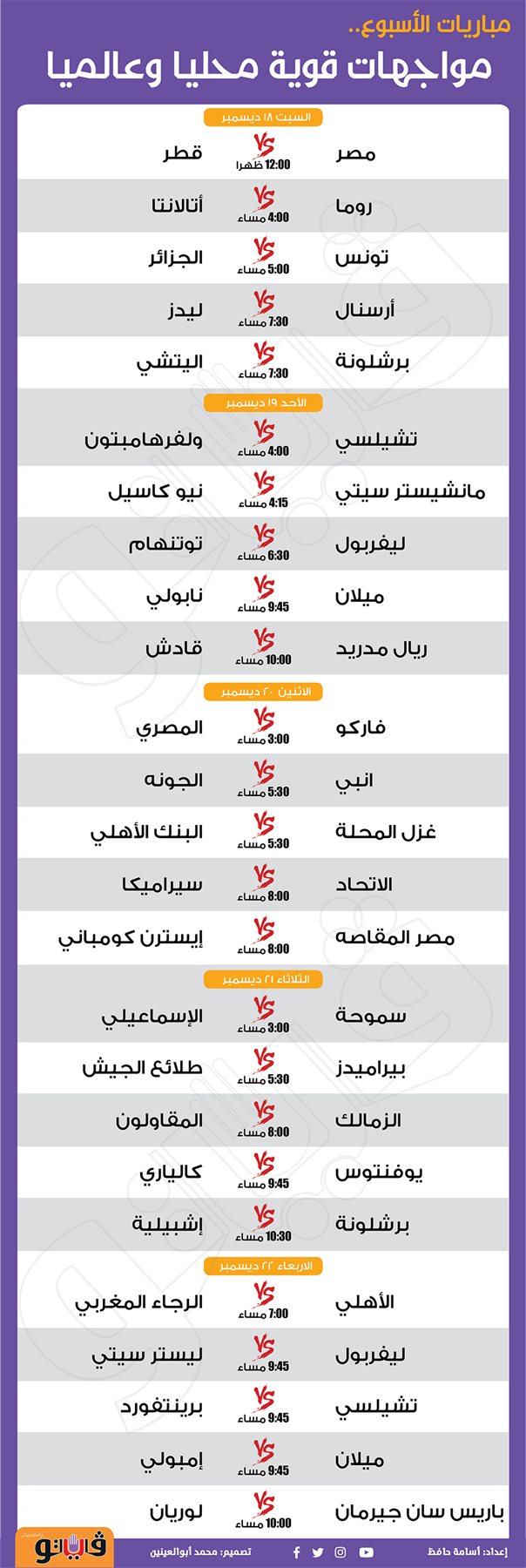 مباريات الأسبوع.. مواجهات قوية محليا وعالميا | انفوجراف الجمعة 17/ديسمبر/2021 - 05:58 م 12/17/2021 5:58:11 PM مباريات الأسبوع اسامة حافظ شارك طباعة 18 حجم الخط شارك طباعة ليفربول الأهلي باريس باريس سان جيرمان الرجاء المغربي مانشيستر سيتي ليفربول مع ليستر سيتي الاسبوع