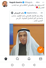 وكتب ساويرس في تدوينة علي موقع التدوينات القصيرة" الله يرحمه رجل عظيم في أخلاقه وفي حبه لبلده ومصر"