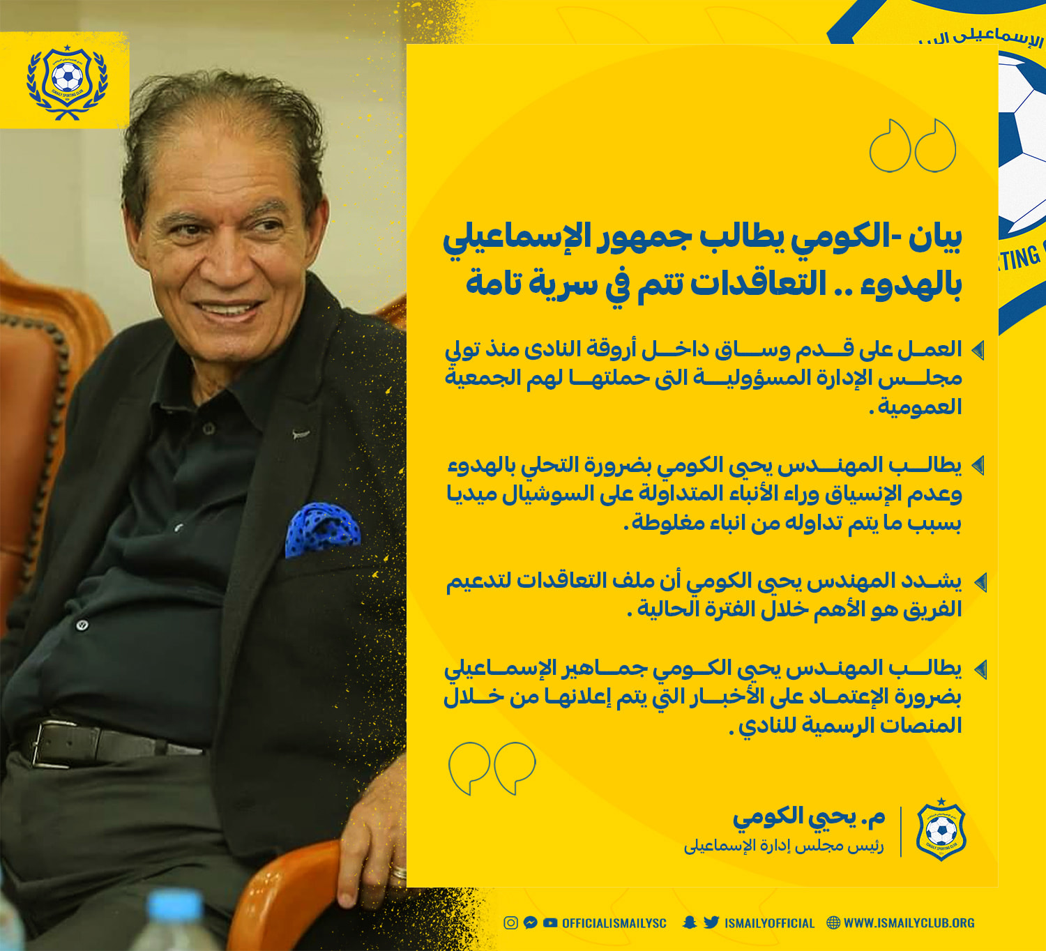 وطالب المهندس يحيى الكومي، جماهير الإسماعيلي، بضرورة الاعتماد على الأخبار التي يتم إعلانها من خلال المنصات الرسمية للنادي، سواء صفحاته على السوشيال ميديا أو الموقع الرسمي، باستثناء ذلك فإن كل ما يتم نشره ليس في مصلحة النادي.