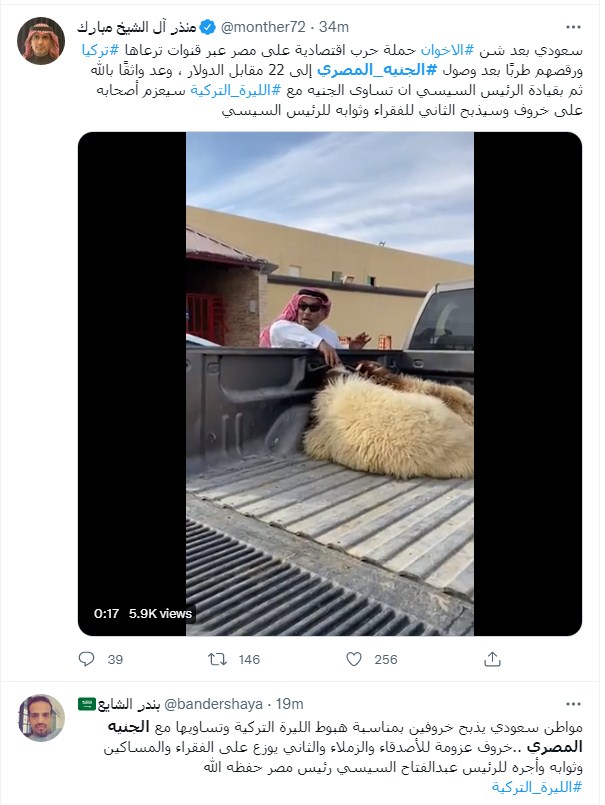 أثار انخفاض الليرة التركية مقابل الدولار، وارتفاع الجنيه المصري أمام الليرة حالة من الفرحة لدي النشطاء العرب، وخاصة رواد مواقع التواصل الاجتماعي بدول الخليج، وتداولوا مقطع فيديو لأحد السعوديين وهو يذبح "خروفين" ابتهاجًا بصعود الجنيه المصري أمام الليرة.