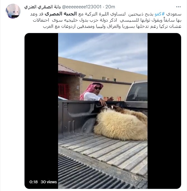وعلقت دانة الصقري العنزي قائلة "سعودي #كفو يذبح ذبيحتين لتساوي الليرة التركية مع الجنية المصري قد وعد بها سابقًا ".