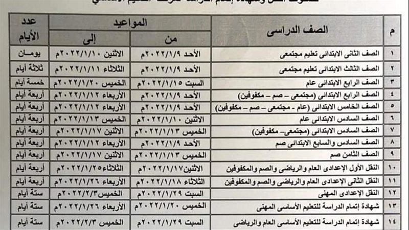 وأضاف محمود أنه تم وضع كافة الجداول الخاصة بـ امتحانات صفوف النقل والشهادة الإعدادية ومدارس المكفوفين والتعليمات المجتمعي والإعدادية المهنية والنقل للصفوف الثانوية العامة