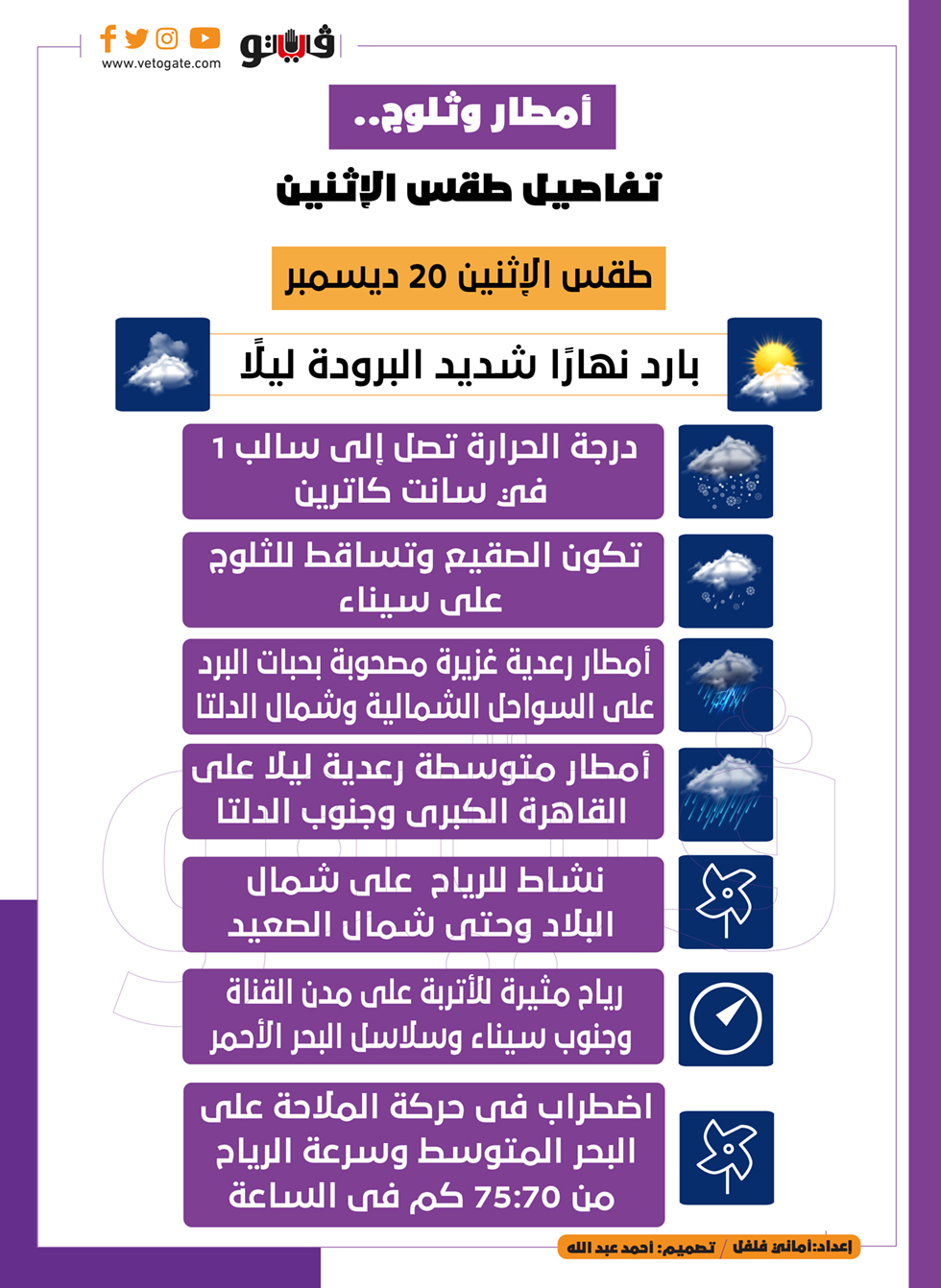 أمطار وثلوج.. تفاصيل طقس الإثنين | إنفوجراف الأحد 19/ديسمبر/2021 - 09:19 م 12/19/2021 9:19:32 PM حالة الطقس أماني فلفل شارك طباعة 18 حجم الخط شارك طباعة الطقس أخبار هيئة الأرصاد اخبار درجات الحرارة