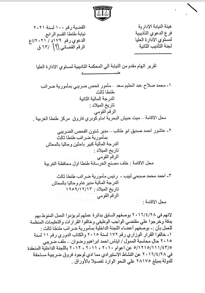 قرار الإحالة شمل كلًا من محمد صلاح عبد الحليم، مأمور فحص ضريبي بمأمورية ضرائب طنطا ثالث وعاشور أحمد صديق، مدير شئون الفحص الضريبي بالمأمورية وأحمد محمد صبحي، رئيس المأمورية