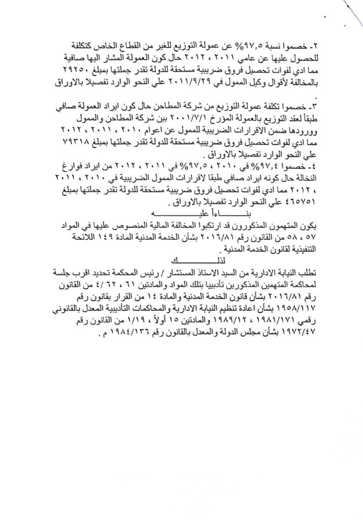 قررت النيابة الإدارية في القضية رقم 131 لسنة 63 قضائية عليا إحالة رئيس مأمورية ضرائب طنطا ثالث مدير شئون الفحص ومأمور ضرائب للمحاكمة التأديبية بعد ثبوت إرتكابهم مخالفات مالية وإدارية ترتب عليها الإضرار بالمال العام