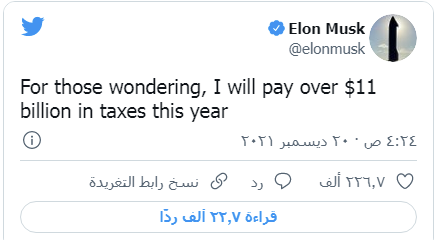 قال رجل الأعمال الأمريكي إيلون ماسك، في تغريدة على "تويتر" أمس الأحد، إنه يعتزم تسديد أكثر من 11 مليار دولار كضرائب هذا العام.