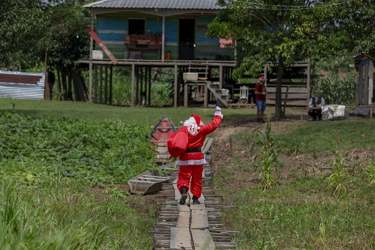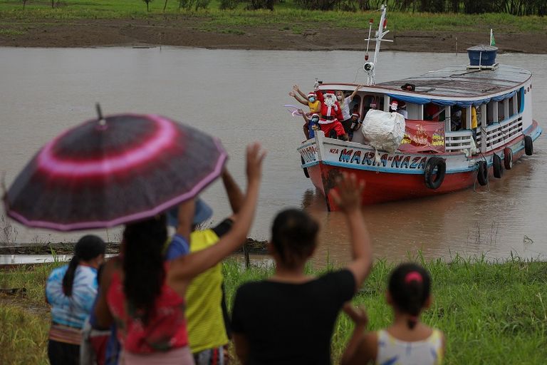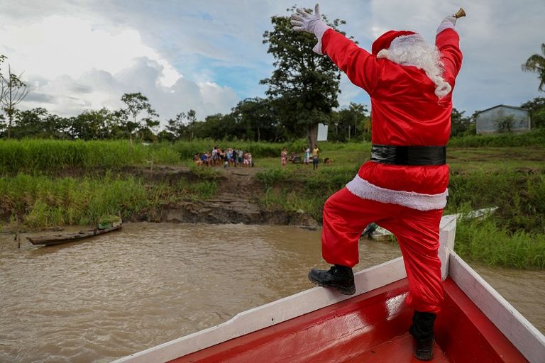 في قلب منطقة الأمازون البرازيلية، تخلى سانتا كلوز عن عربته التقليدية للجلوس في مقدمة قارب مزود بمحرك، حيث يرحّب بالأطفال الذين ينتظرونه بثبات على الشاطئ.
