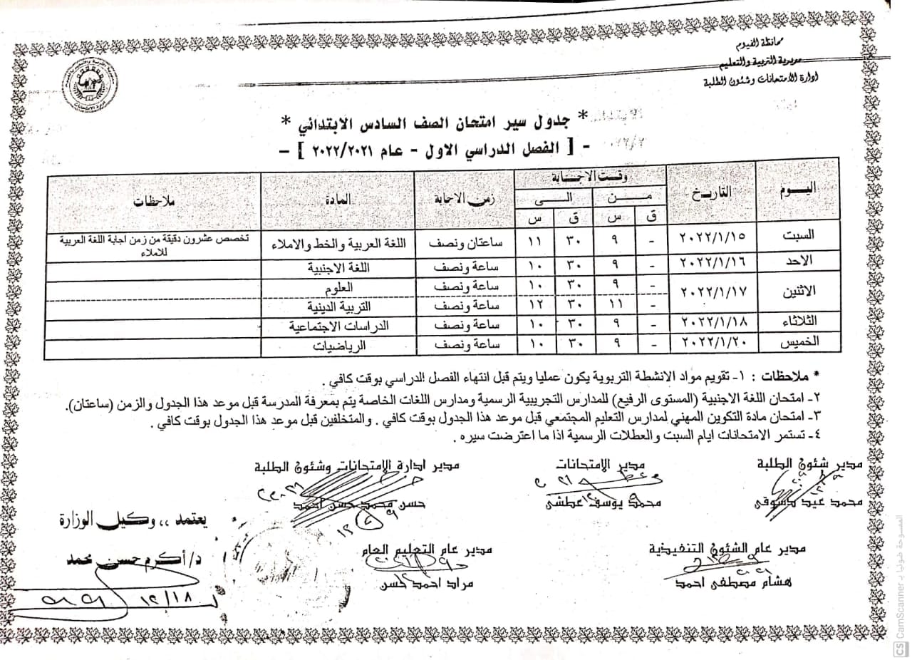 يذكر أن العام الدراسي بدأ السبت ٩/ ١٠/ ٢٠٢١ وينتهي يوم الخميس ١٦/ ٦/ ٢٠٢٢ ويستمر لمدة ٣٤ أسبوعًا، وتكون مدة أيام الدراسة الفعلية بعد حذف أيام الإجازات الرسمية ٩٣ يومًا للفصل الدراسي الأول و٩٧ يومًا للفصل الدراسي الثاني، على أن تكون أيام الدراسة الفعلية ١٩٠ يومًا بما يعادل ٣٢ أسبوعًا. تعتبر فترة امتحانات الفصلين الدراسيين الأول والثاني ضمن أيام الدراسة الفعلية وتحتسب ضمن نسبة الحضور.