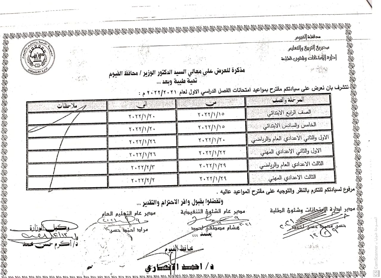 وتبدأ امتحانات الفصل الدراسي الأول بمحافظة الفيوم ٩ يناير وتستمر حتى ٣ فبراير ٢٠٢٢.