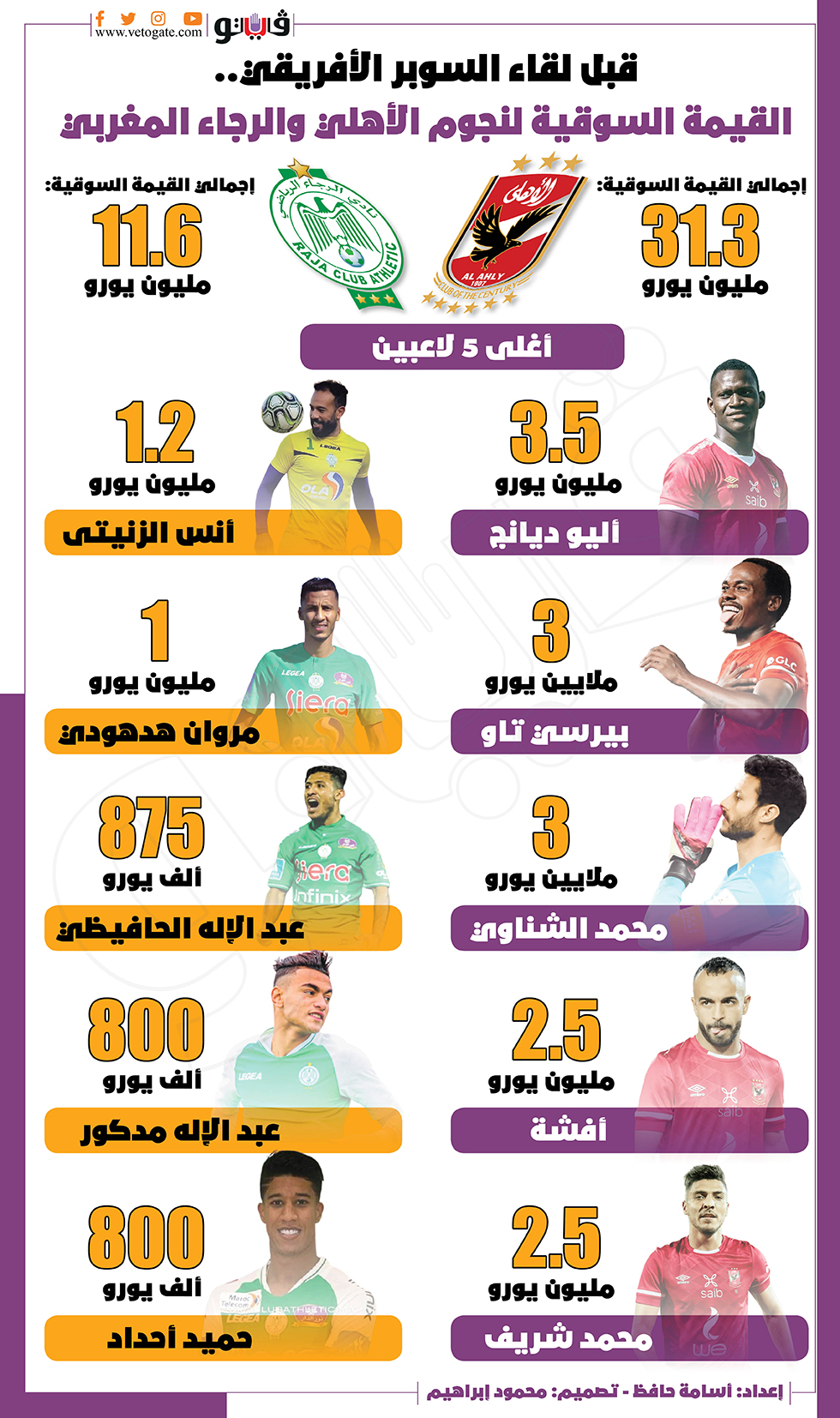 قبل لقاء السوبر الأفريقي.. القيمة السوقية لنجوم الأهلي والرجاء المغربي | انفوجراف الثلاثاء 21/ديسمبر/2021 - 10:14 م 12/21/2021 10:14:35 PM الأهلي اسامة حافظ شارك طباعة 18 حجم الخط شارك طباعة الأهلي الرجاء لقاء السوبر القيمة السوقية الاهلي والرجاء