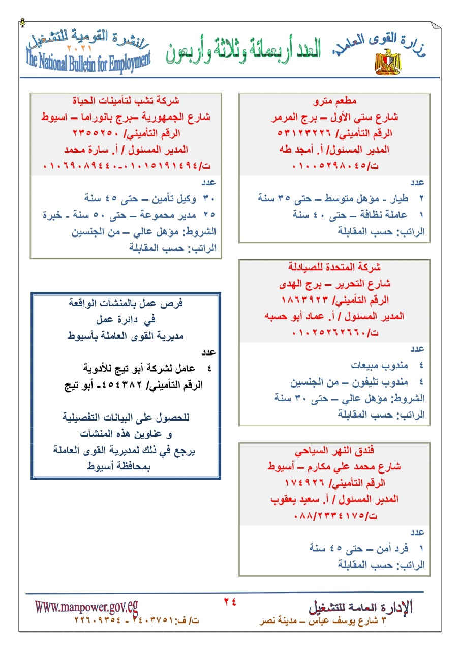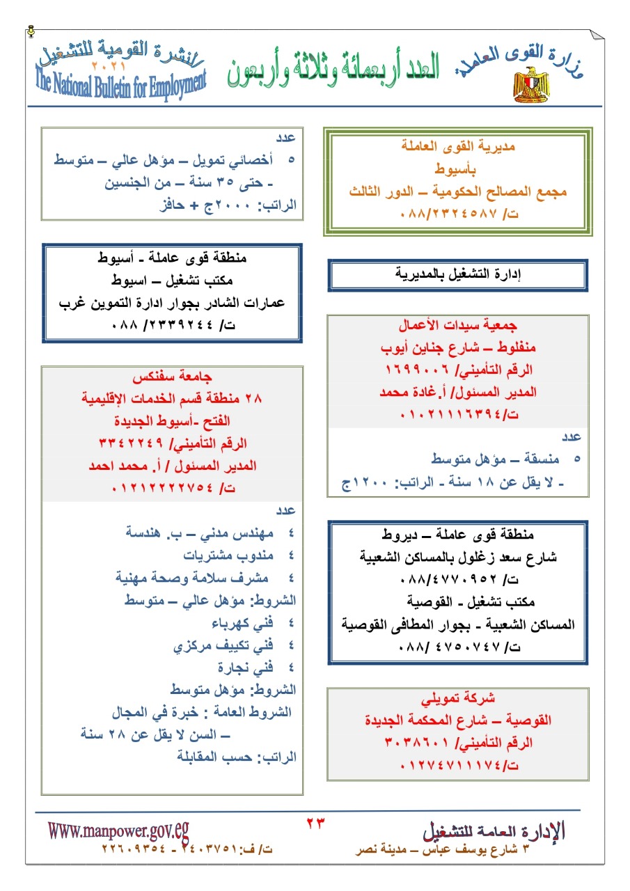 أما أسيوط فقد وفرت فرص عمل متنوعة في العديد من المجالات ومنها: 5 منسقة، و5 أخصائي تمويل، و4 مهندس مدني، و4 مندوب مشروبات، و4 مشرف سلامة وصحة مهنية، و4 فنى كهرباء، و4 فنى تبريد وتكييف، و4 فنى نجارة، و2 طيار، و4 مندوب مبيعات، و4 مندوب تليفون، و30 وكيل تأمين، و25 مدير مجموعة، و4 عمال لشركة أدوية، وفرد أمن .
