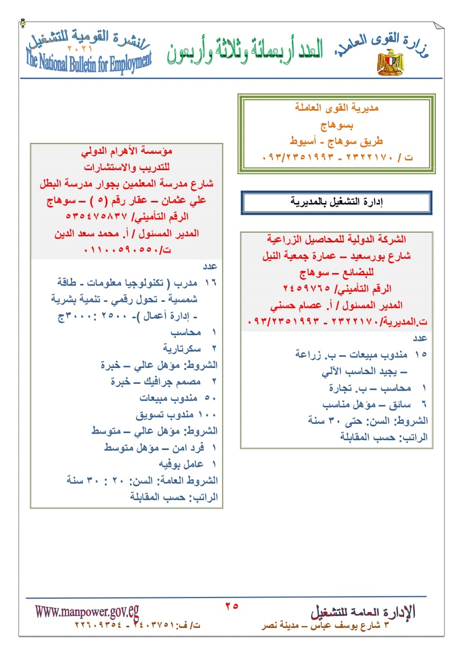كما وفرت مديرية القوى العاملة بسوهاج مجموعة من فرص العمل شملت: 65 مندوب مبيعات، ومحاسب، و100 مندوب تسويق، و16 مدربًا (تكنولوجيا معلومات - وطاقة شمسية -وتحول رقمي )، و2 سكرتارية، و2 مصمم جرافيك، وعامل بوفيه، و6 سائق .