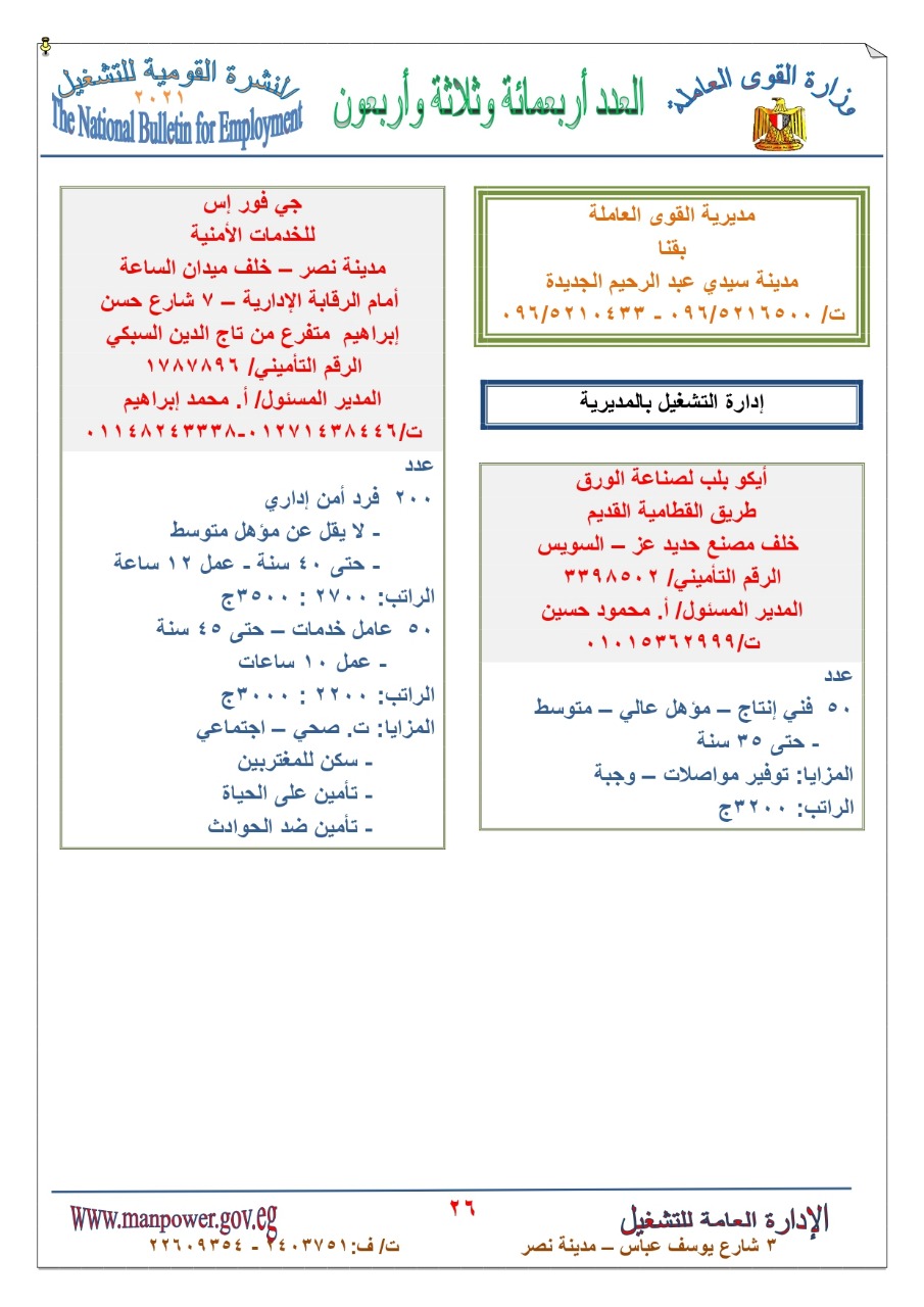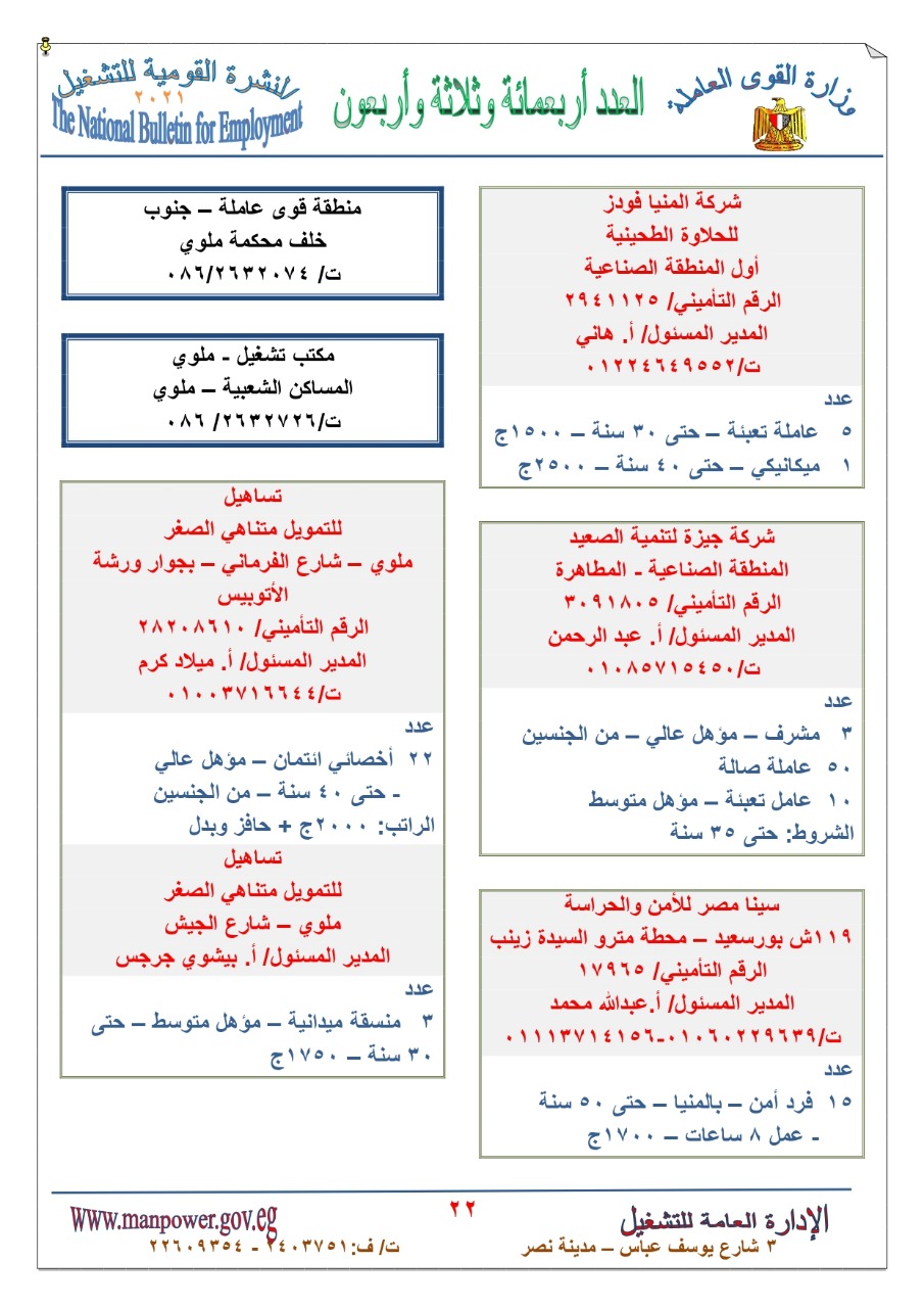 كما وفرت مديرية القوى العاملة بالمنيا مجموعة من فرص العمل شملت: 100 عامل خياطة، و2 مراقب جودة، و4 مدرسين رياضيات وعلوم، و5 مشرف، و50 عامل صالة، و10 عمال تعبئة، و15 فرد أمن، و3 منسق ميداني، و22 أخصائي إئتمان، و3 عمال مخازن، وسائق كلارك .