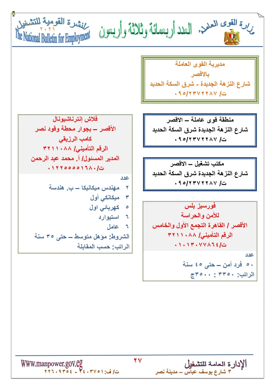 وفي الأقصر وقنا والوادي الجديد يوجد 250 فرد أمن إداري، و20 عمال خدمات براتب 3000 جنيه، و50 فنى إنتاج، و2 مهندس ميكانيكا، ومسئول علاقات عامة، و10 عمال زراعة، وشيف شواية، و2 شيف طاهي، و6 استيوارد، و3 ميكانيكي، و5 كهربائي، و6 عمال عاديين.