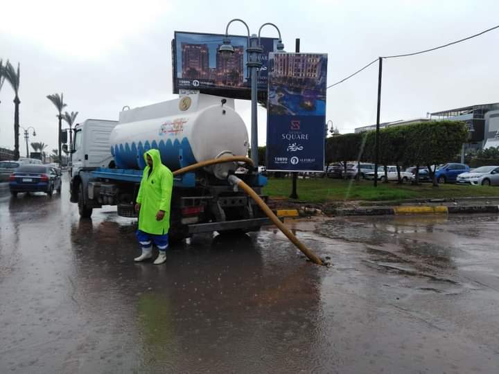 وتتمركز سيارات الصرف الصحي في الميادين وكورنيش البحر لشفط مياه الأمطار وتسليك الشنايش وإنشاء شنايش جديدة لتيسير الحركة المرورية أمام السيارات والمواطنين.
