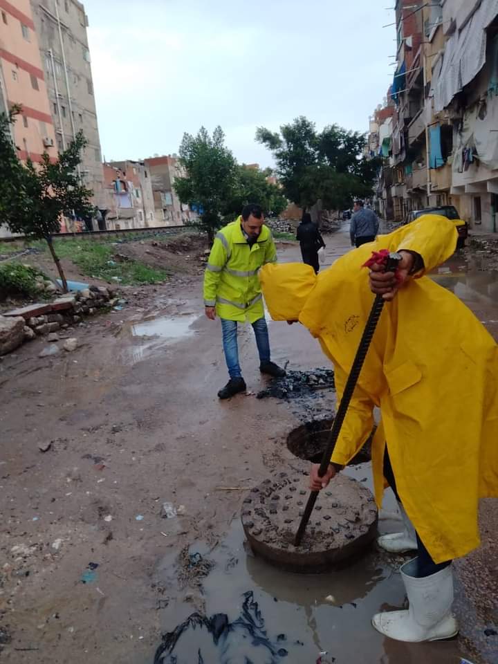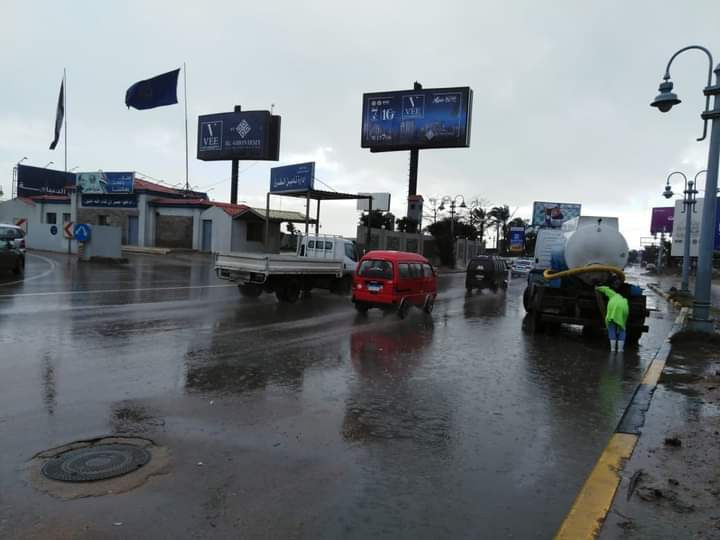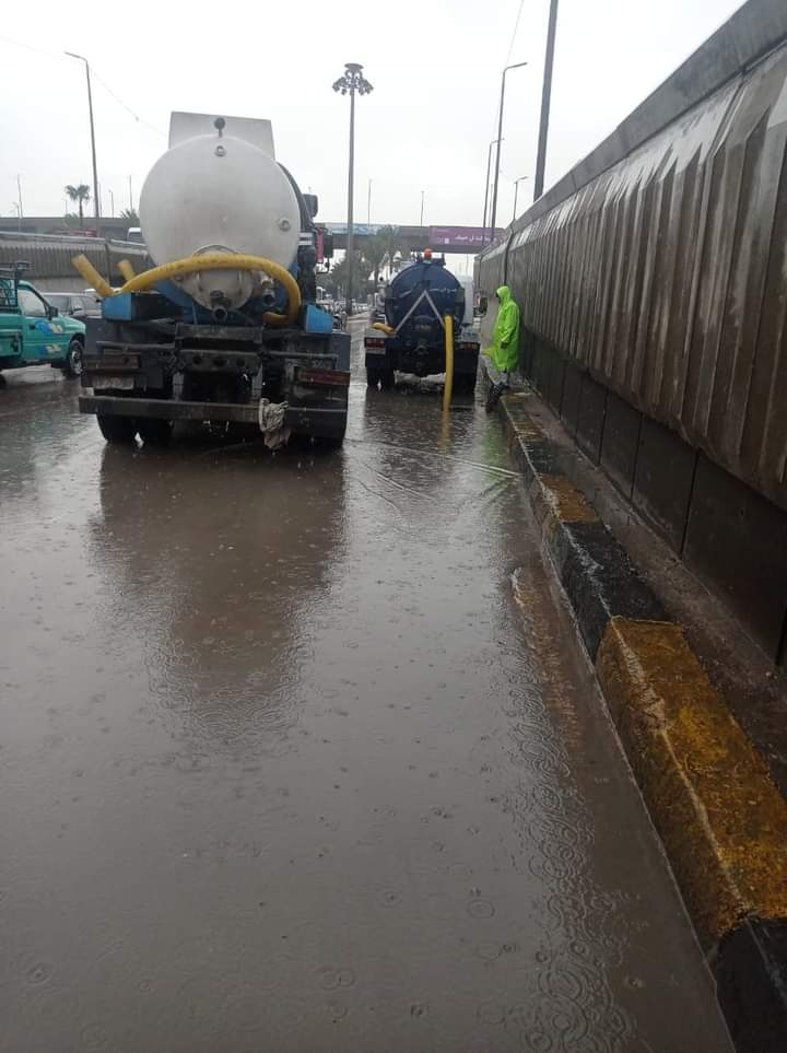 شارع الهيلتون جرين بلازا، وبشارع مصطفي كامل الرأس السوداء، وتواصلت أعمال تطهير الشنايش والبيارات أثناء استمرار الأمطار