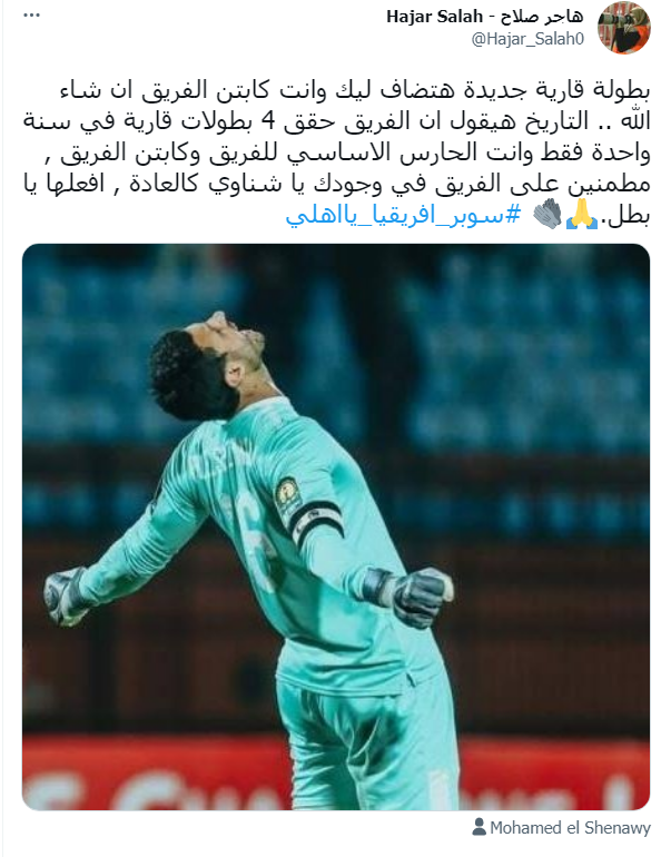 وكتبت هاجر صلاح: “بطولة قارية جديدة سوف تضاف إلى الكابتن محمد الشناوي بإذن الله.. التاريخ هيقول إن الفريق حقق 4 بطولات قارية في سنة واحدة فقط وانت الحارس الأساسي للفريق وكابتن الفريق، مطمنين على الفريق في وجودك يا شناوي كالعادة، افعلها يا بطل”.