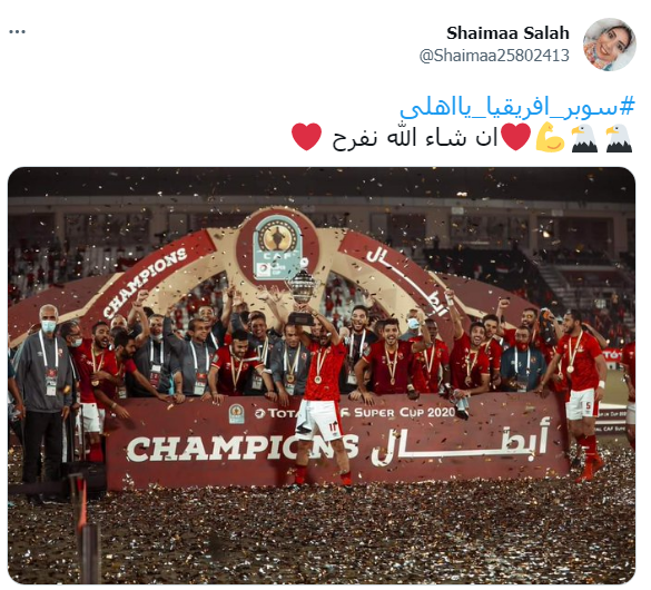 وأضافت إيمان صلاح: "#سوبر_افريقيا_يااهلى إن شاء الله نفرح.