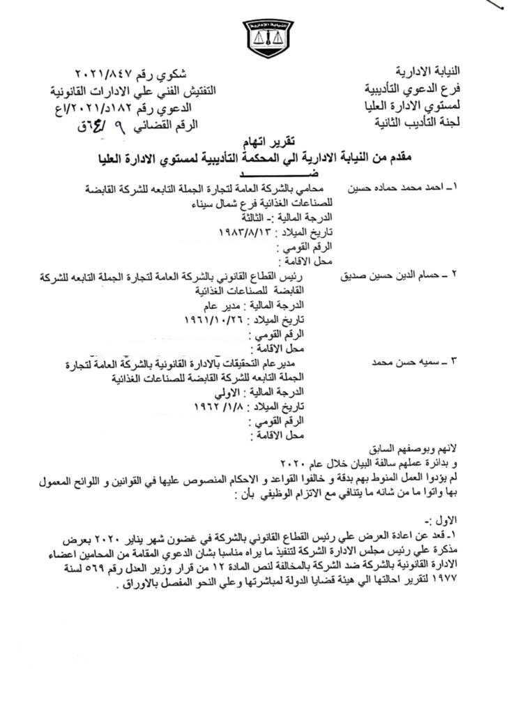 قررت وزارة العدل في القضية رقم 7 لسنة 63 قضائية عليا إحالة رئيس القطاع القانوني بالشركة العامة لتجارة الجملة التابعة للشركة القابضة للصناعات الغذائية ومدير عام التحقيقات وأحد المحامين بالشركة للمحاكمة التأديبية العاجلة لارتكابهم مخالفات قانونية وإدارية جسيمة في مجال عملهم.