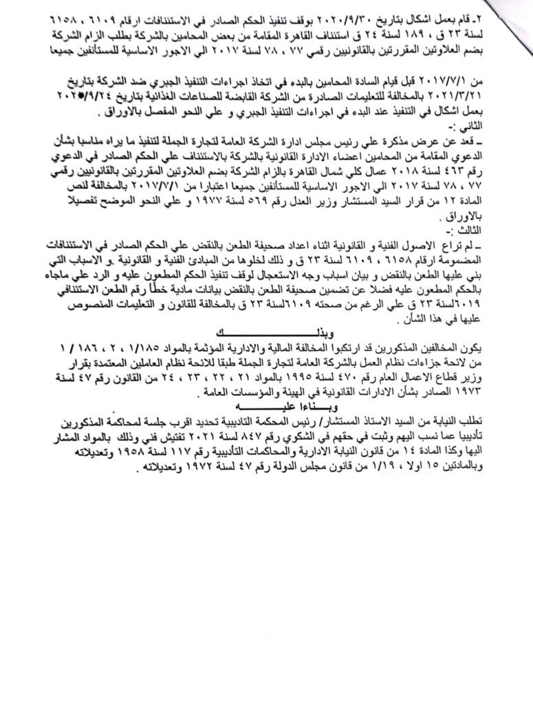 كما قام المحال بعمل إشكال بتاريخ 30 سبتمبر 2020 لوقف تنفيذ الحكم الصادر الصادر في الاستئنافات أرقام 6109 ـ 6158 لسنة 23 قضائية و189 لسنة 24 قضائية استئناف القاهرة المقامة من بعض المحامين لإلزام الشركة بضم العلاوتين المقررتين بالقانونين 77 ـ 78 لسنة 2017 إلى الأجور الأساسية للمستأنفين إعتبارًا من أول يوليو 2017 قبل قيامهم بالبدء في إتخاذ إجراءات التنفيذ الجبري ضد الشركة بتاريخ 21 مارس 2021، بالمخالفة للتعليمات الصادرة من الشركة القابضة للصناعات الغذائية بتاريخ 24 سبتمبر 2020، بعمل إشكال في التنفيذ عند البدء في إجراءات التنفيذ الجبري.