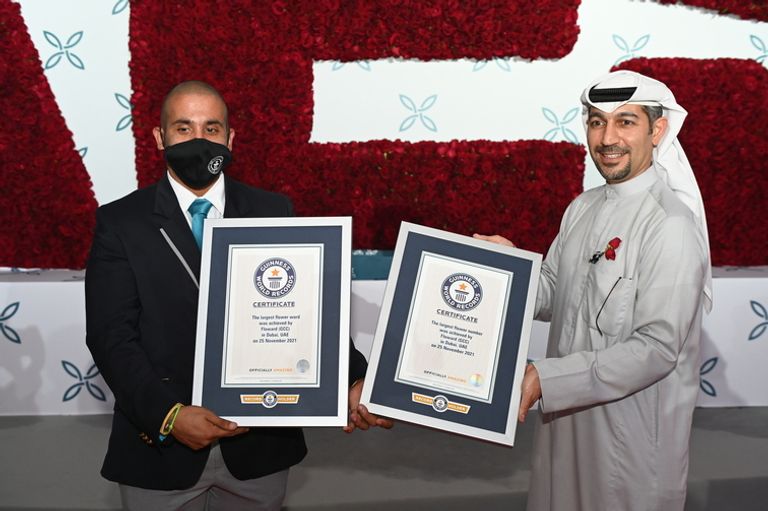 و خلال الاحتفال باليوم الوطني الخمسين لدولة الإمارات، حققت رقمين قياسيين عالميين، هما: أكبر كلمة مشكلة من الورد بإجمالي 11129 وردة، وأكبر عدد مشكل من الورد بعدد 5362 وردة، وبلغ ارتفاع القطعة الفنية بعد استكمالها 3.6 متر.