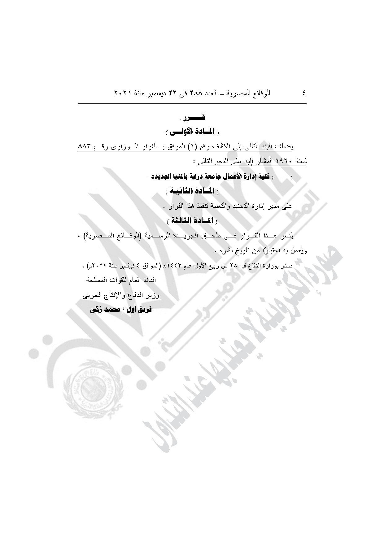 نشرت جريدة الوقائع المصرية في عددها رقم (288)، الصادر في 22 ديسمبر 2021، قرارى وزارة الدفاع والانتاج الحربي، بشأن تأجيل تجنيد الطلبة بكلية إدارة الأعمال جامعة دراية بالمنيا الجديدة، و12 كلية بجامعة الجلالة.